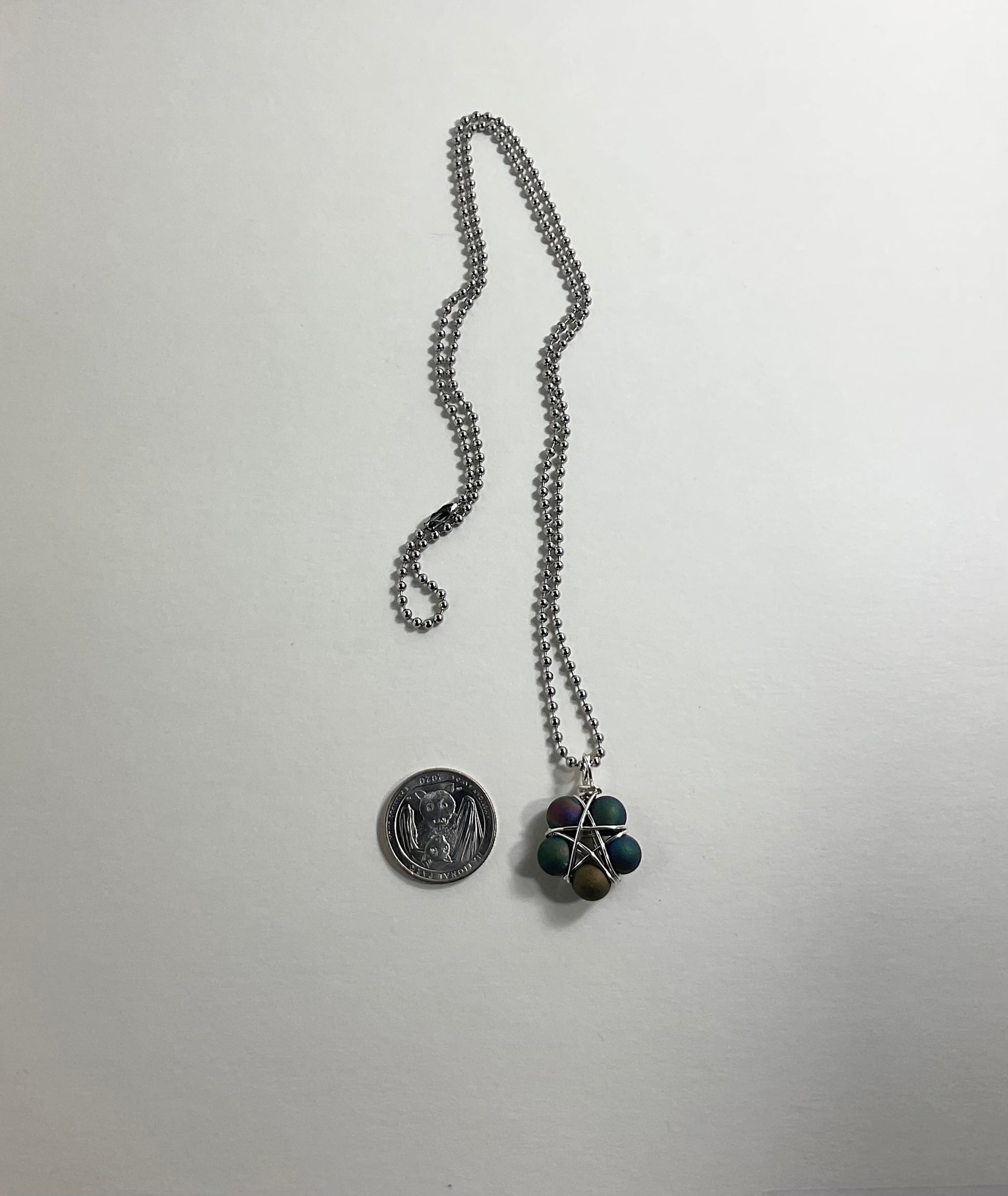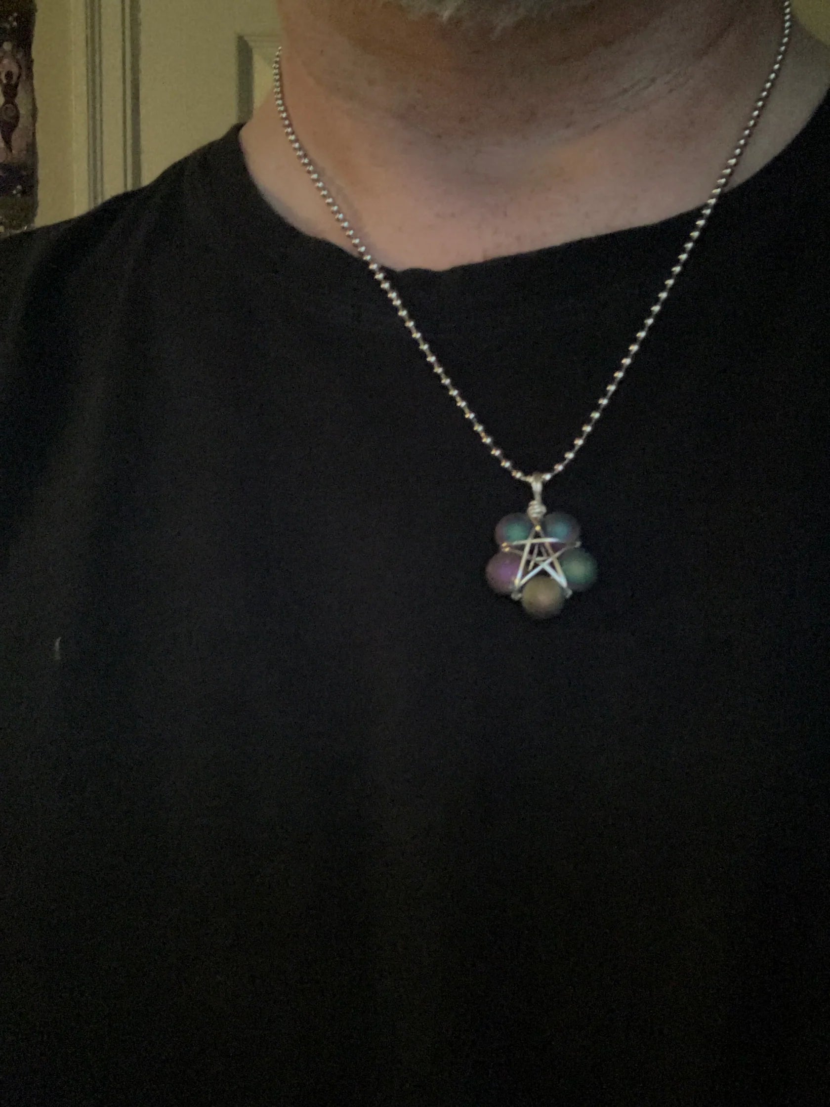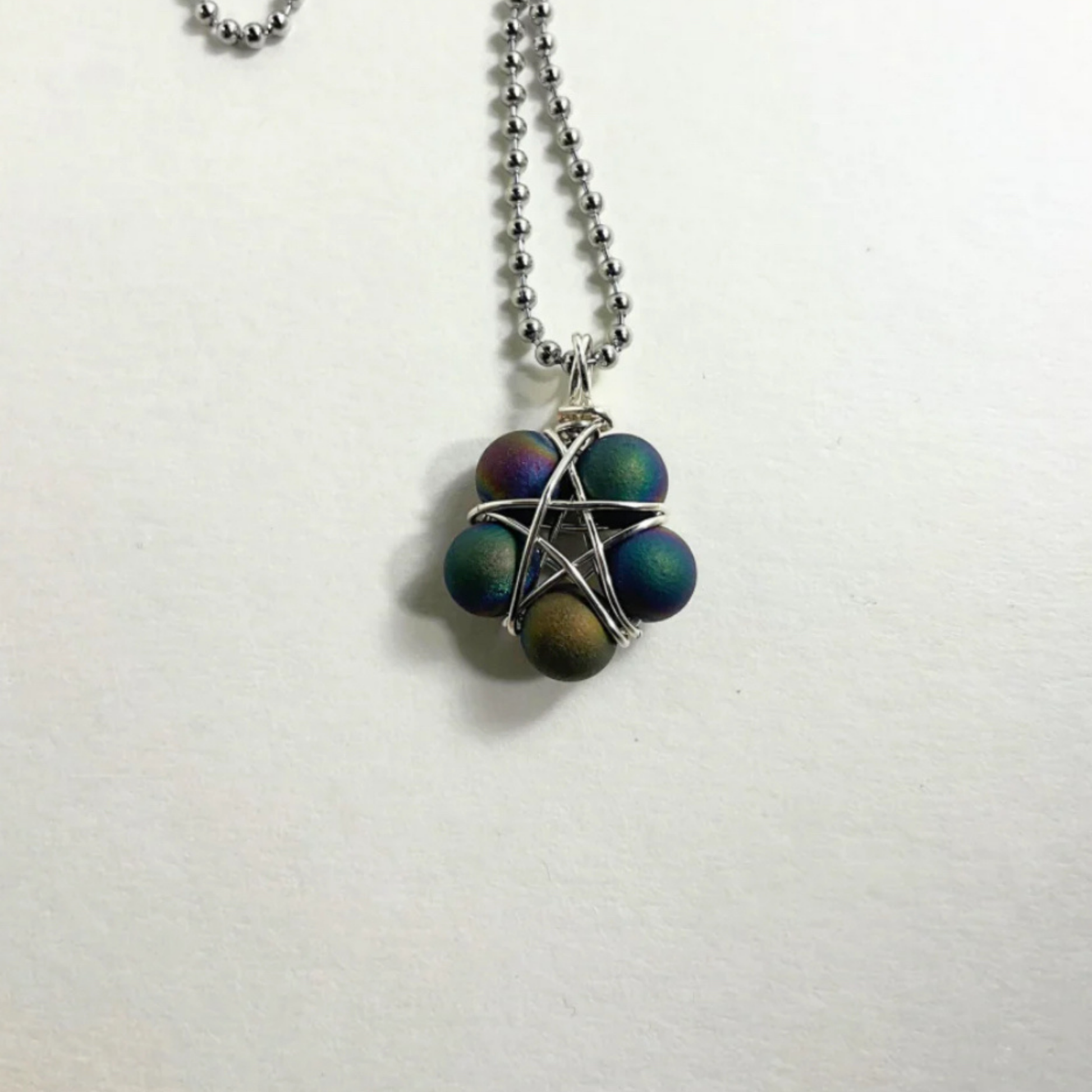 This Pentagram(approximately .750 inch diameter) is lovingly made by Brother Christopher here at Witch House…using five Druzy agate beads (8mm) and silver tone wire. Charm Necklace comes on a Stainless Steel 2.4mm ball chain (24”).
