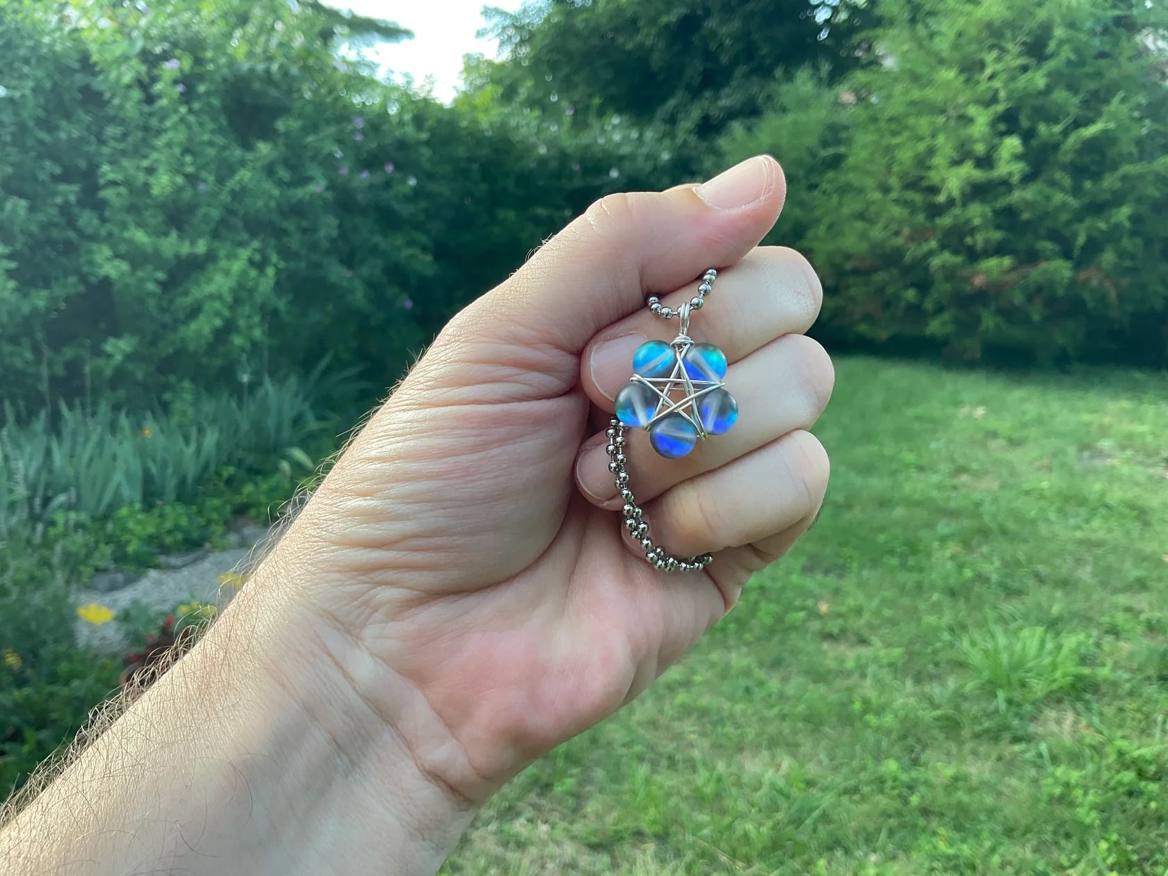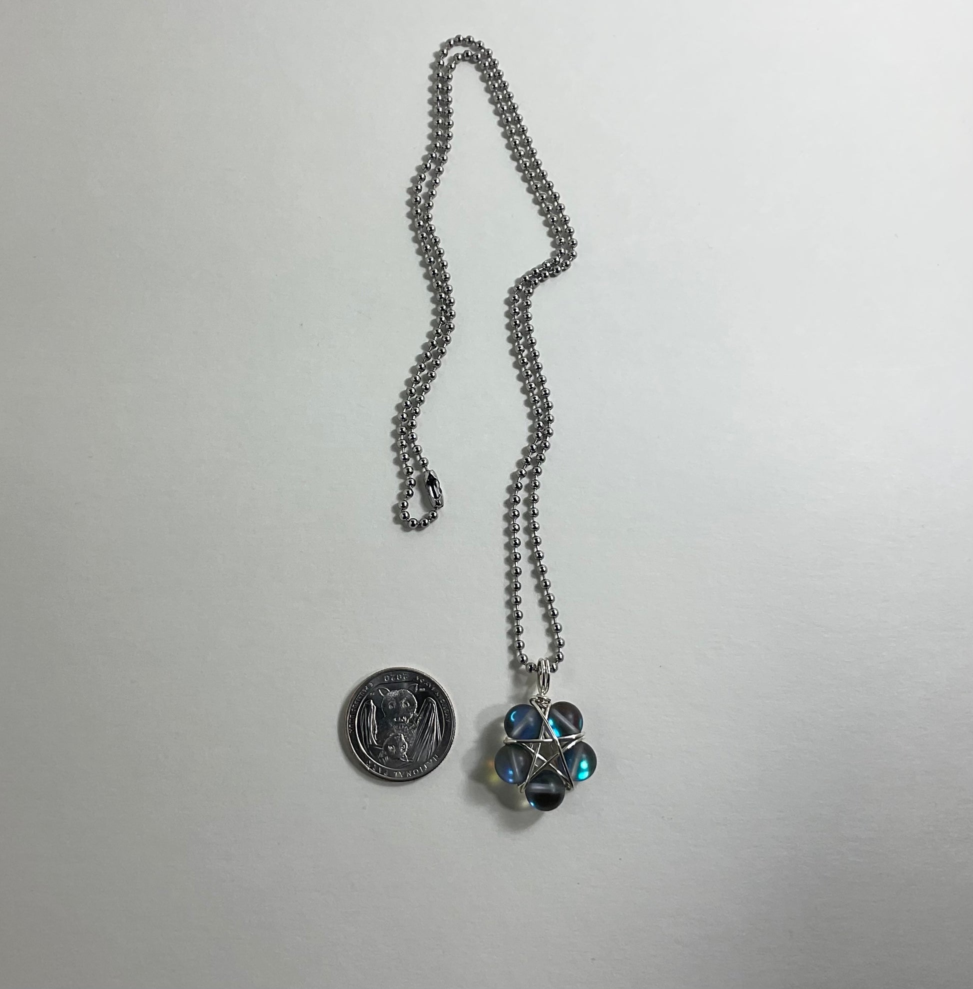 This Pentagram(approximately .750 inch diameter) is lovingly made by Brother Christopher here at Witch House…using five 8mm dark mermaid glass beads and silver tone wire. Charm Necklace comes on a 2.4mm Stainless Steel ball chain (24”).