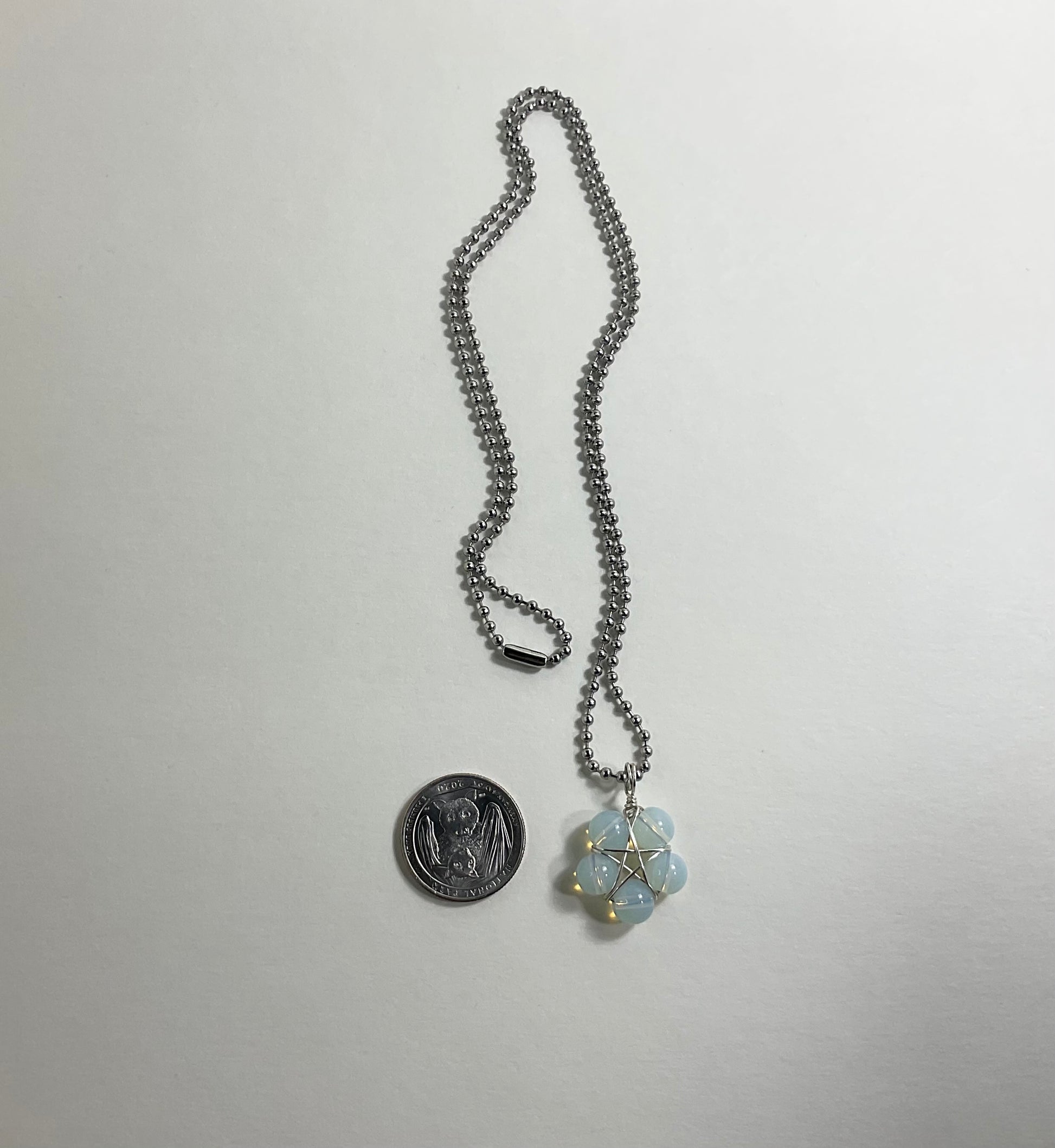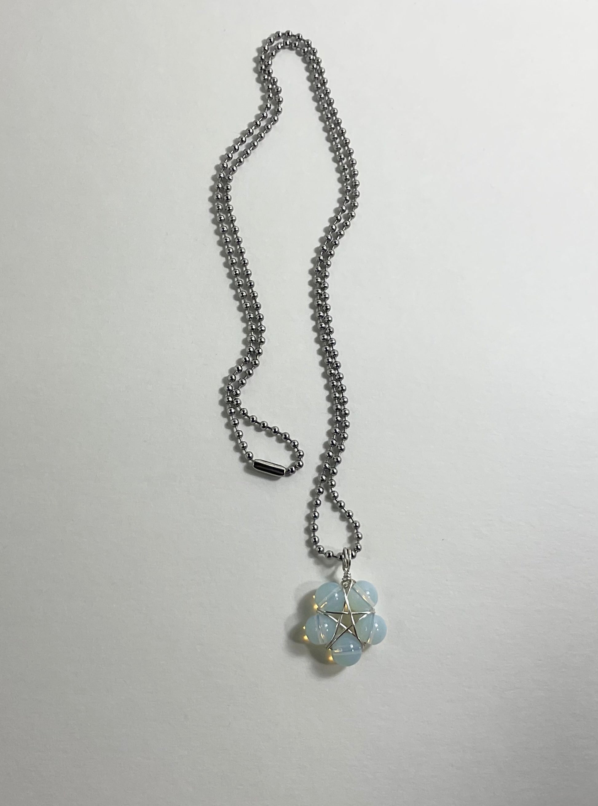 This Opalite Pentagram (approximately .750 inch diameter) is lovingly made by Brother Christopher here at Witch House…using five 8mm Opalite beads and silver tone wire. Charm Necklace comes on a 2.4mm Stainless Steel ball chain (24”).