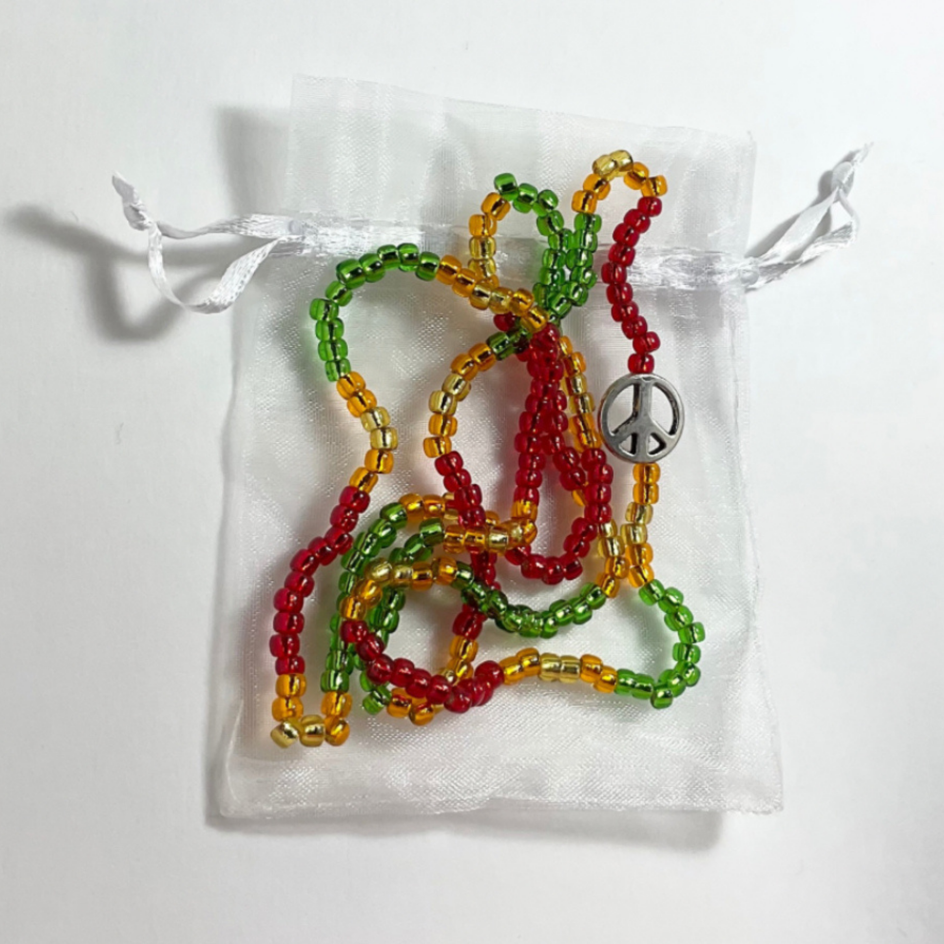 Red Gold and Green Love Beads with silver tone Peace Sign