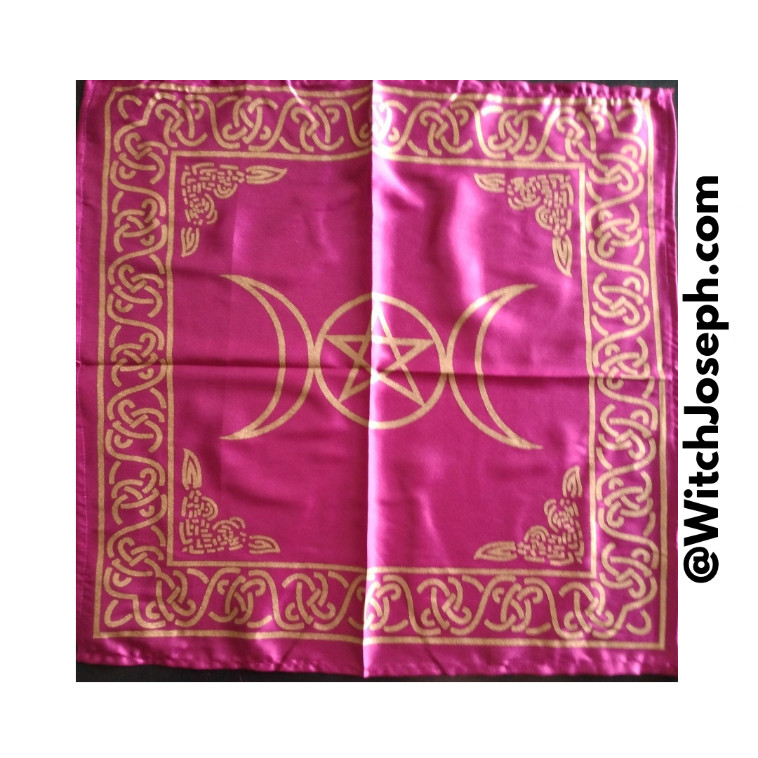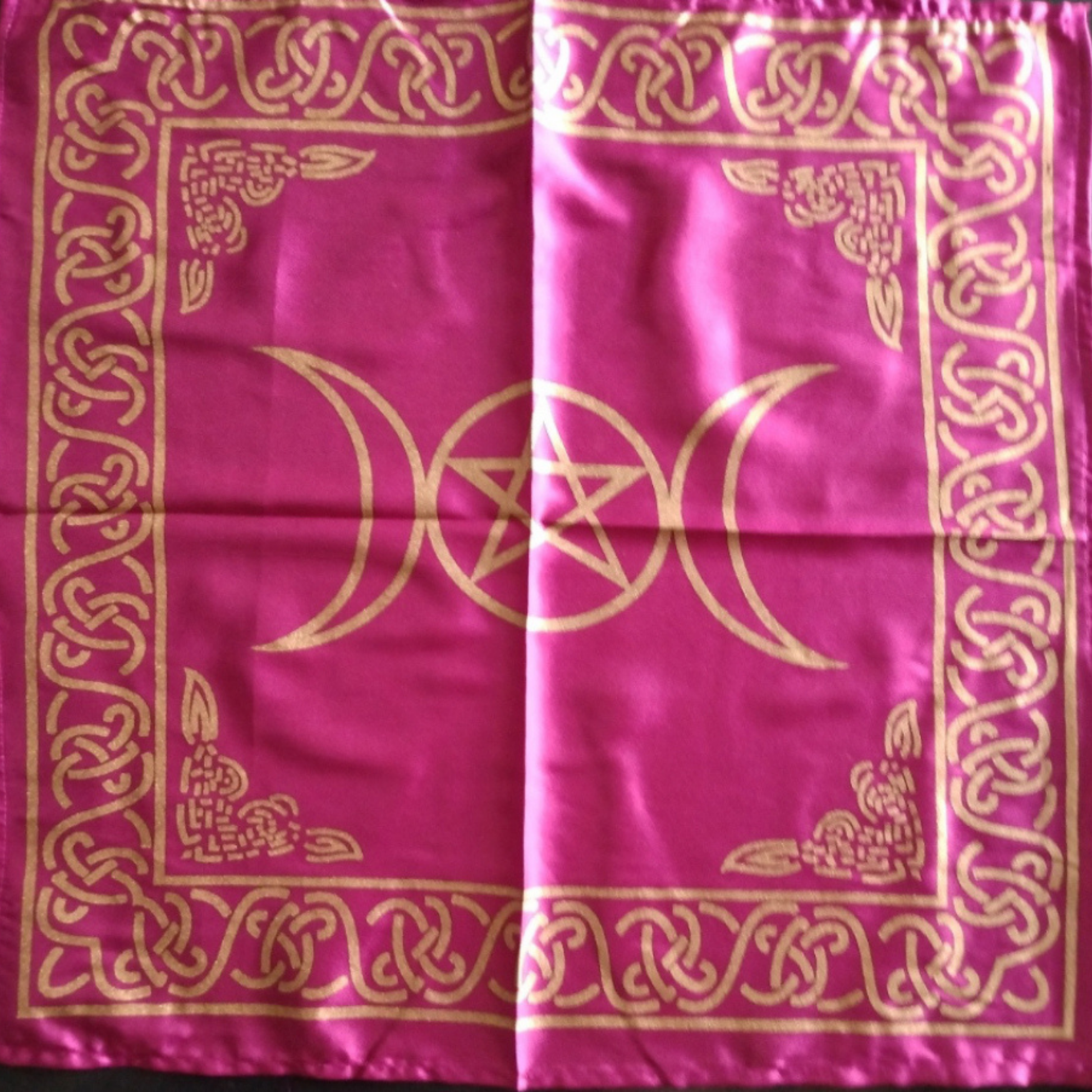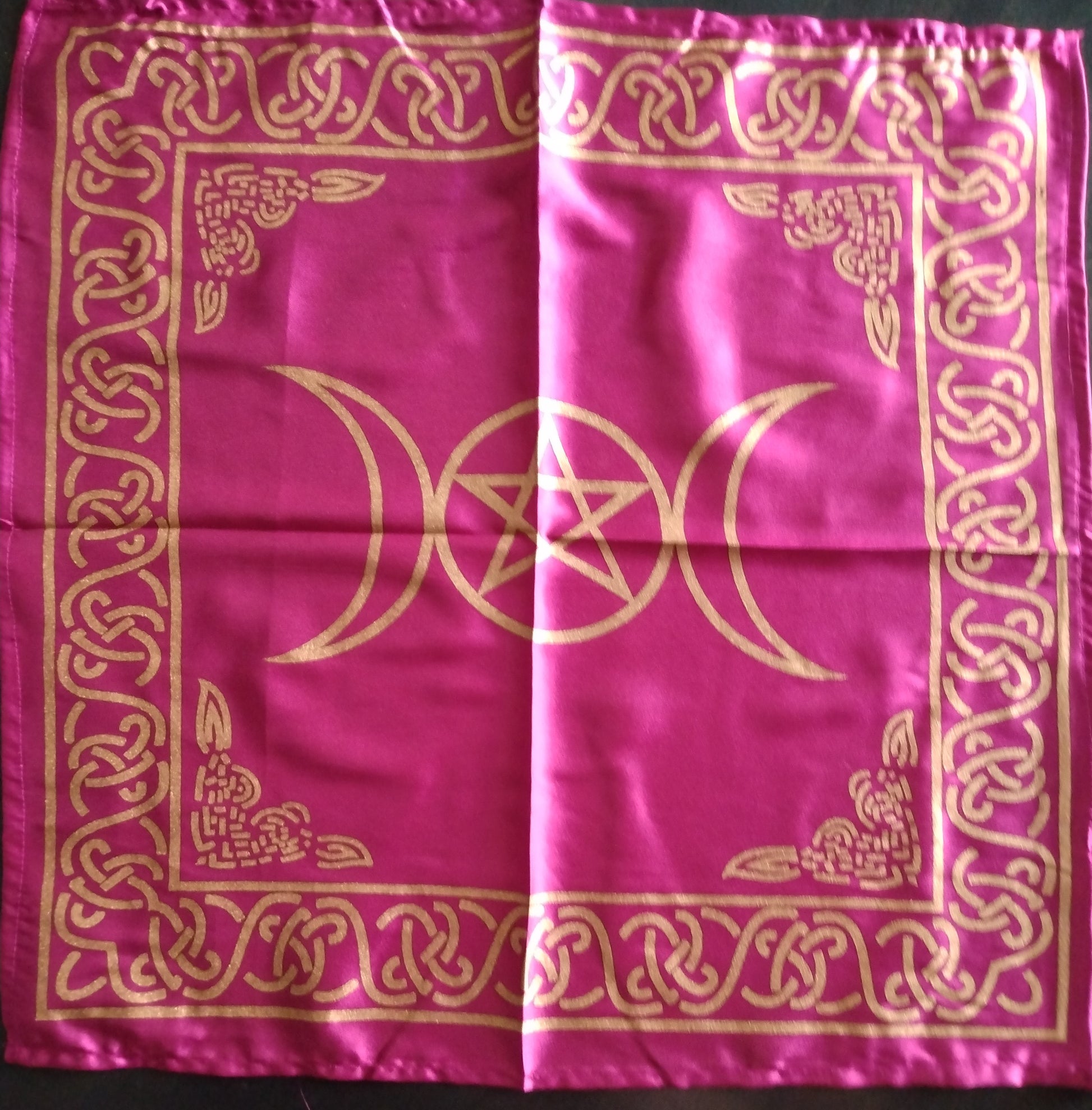 Triple moon altar cloth has gold detailed design on color background. These are excellent for altar, hung ornamentally or as a small scarf accent…also useful for a tarot or divination cloth.