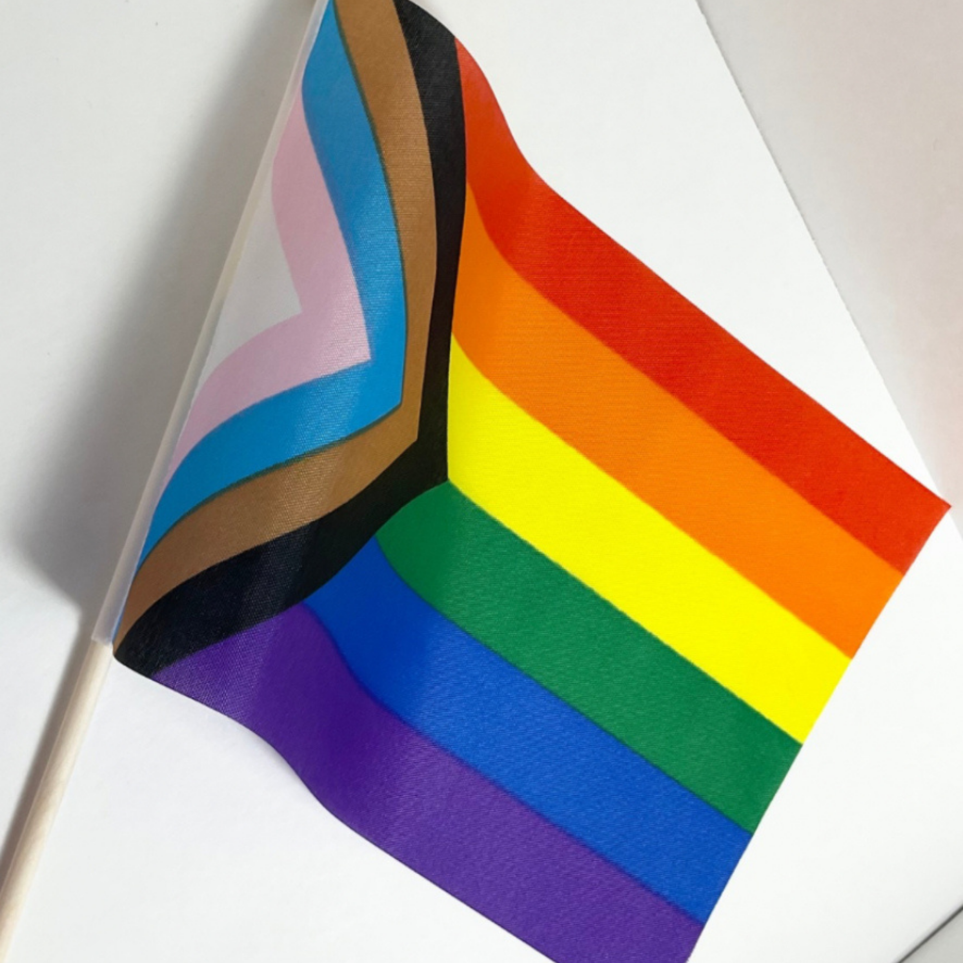 Each Progress flag is made from High-quality durable polyester and is screen printed, the pattern can be clearly seen on the front and back. Each flag is .5.5x8.2 Inch Progress Pride flags and comes on a 12.6 inch wood stick with rounded spear top for additional safety.