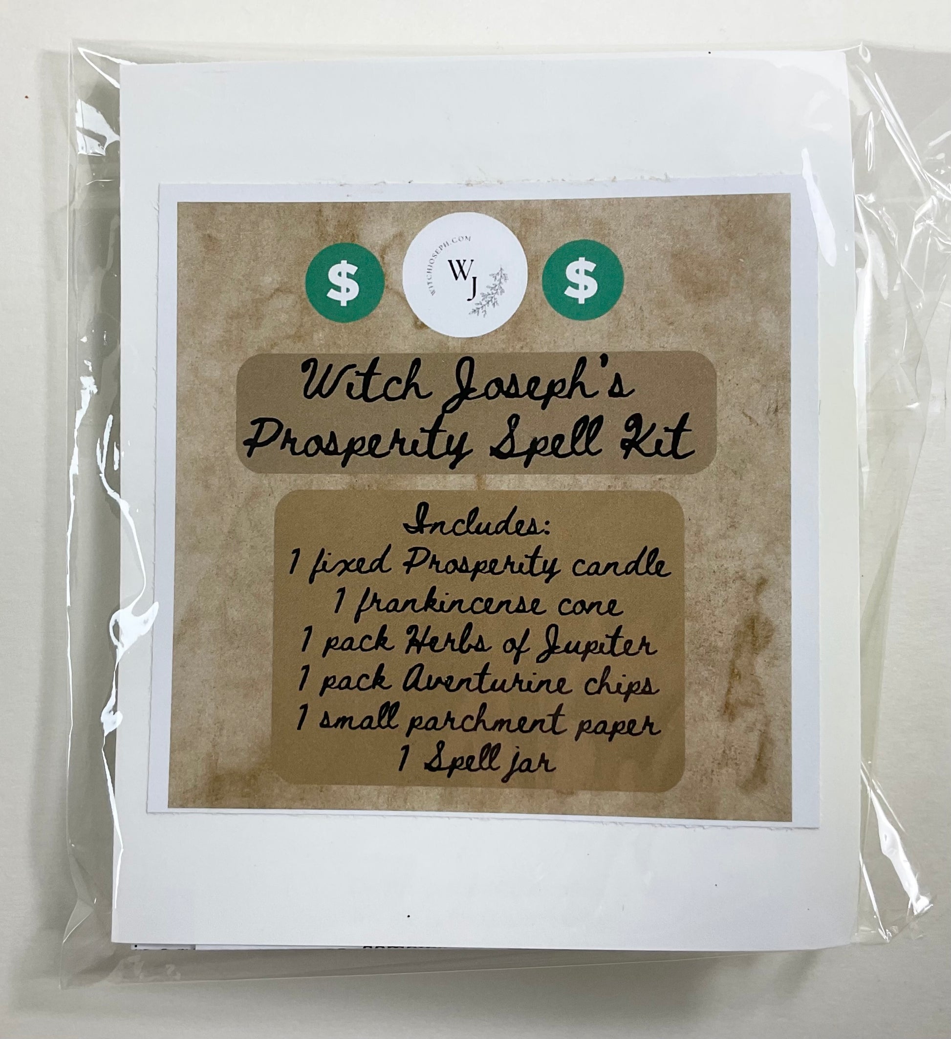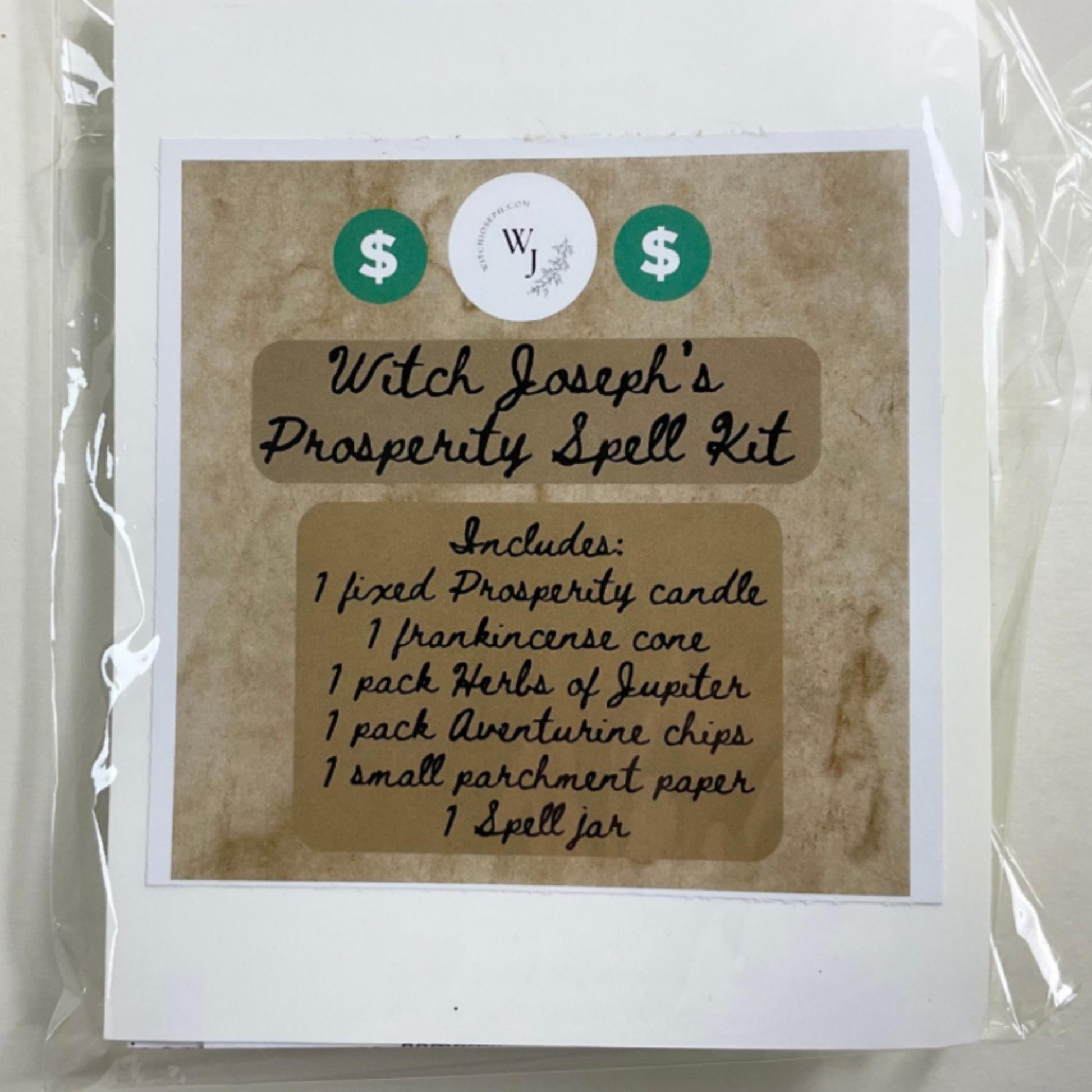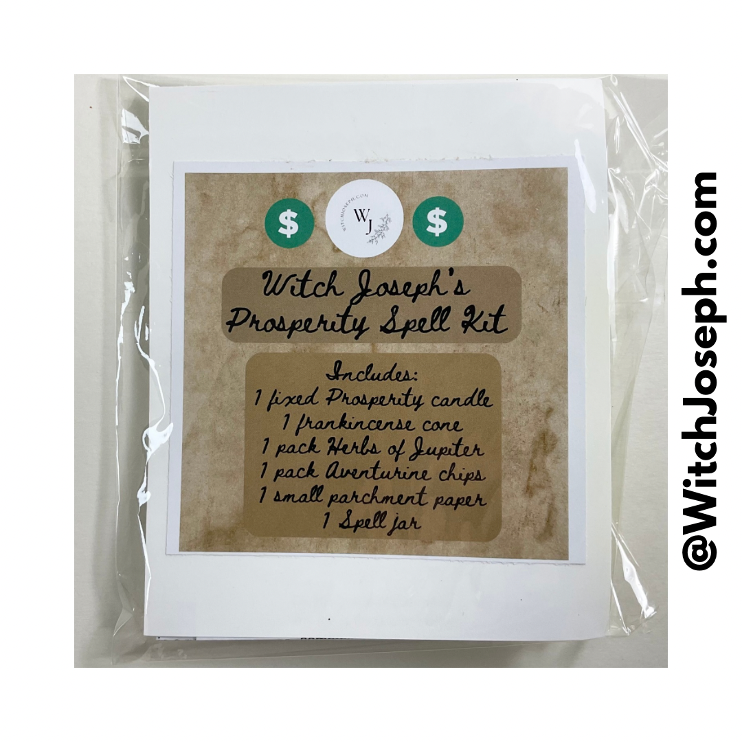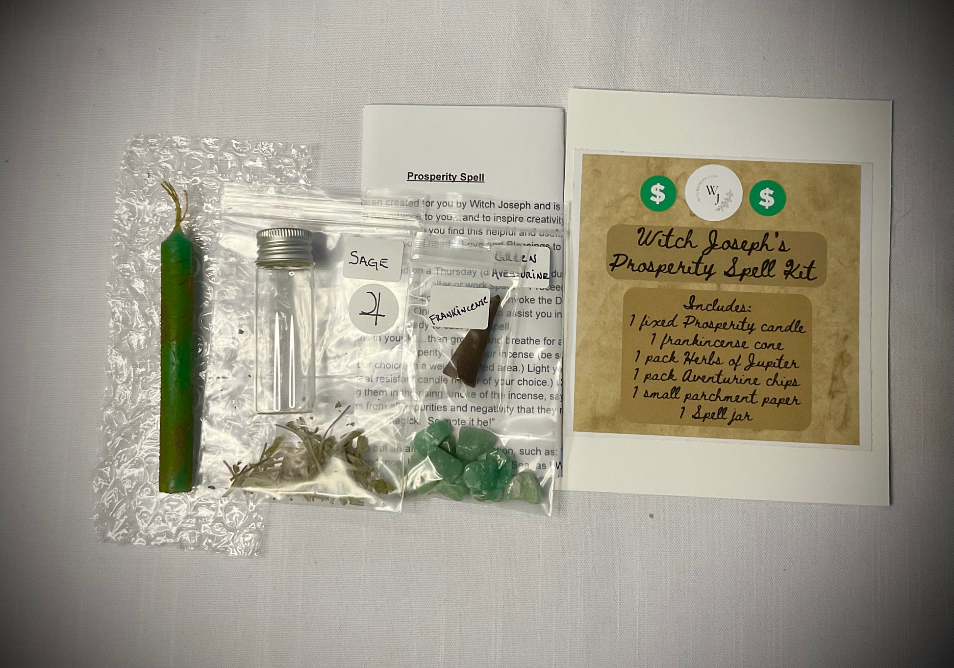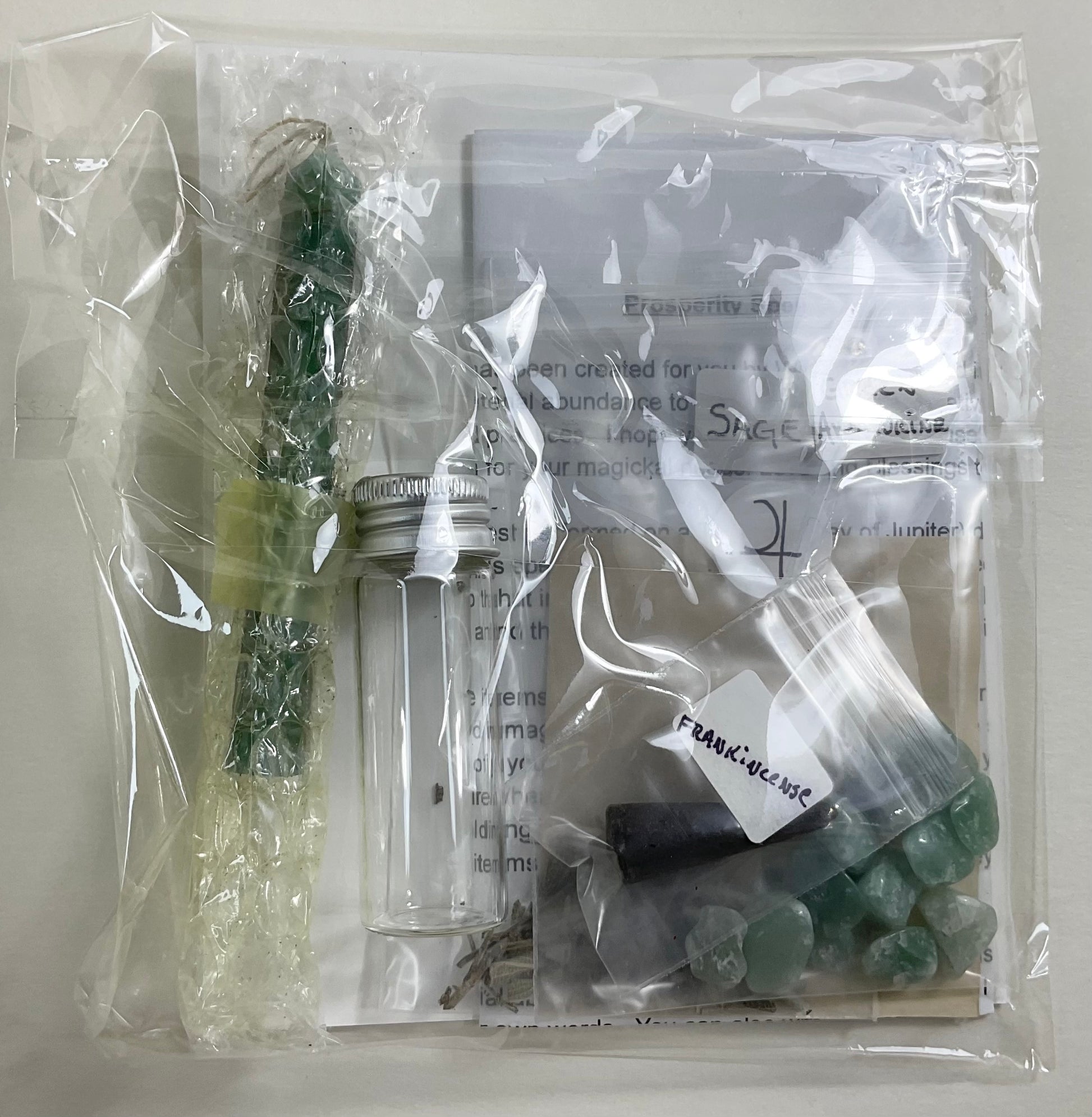 Each Kit comes with: fixed Prosperity candle, spell bottle, 1 pack of aventurine chips, 1 pack herb of Jupiter, 1 frankincense cone, 1 piece of parchment for writing your spell intention on…and of course complete instructions on how to cast this spell.