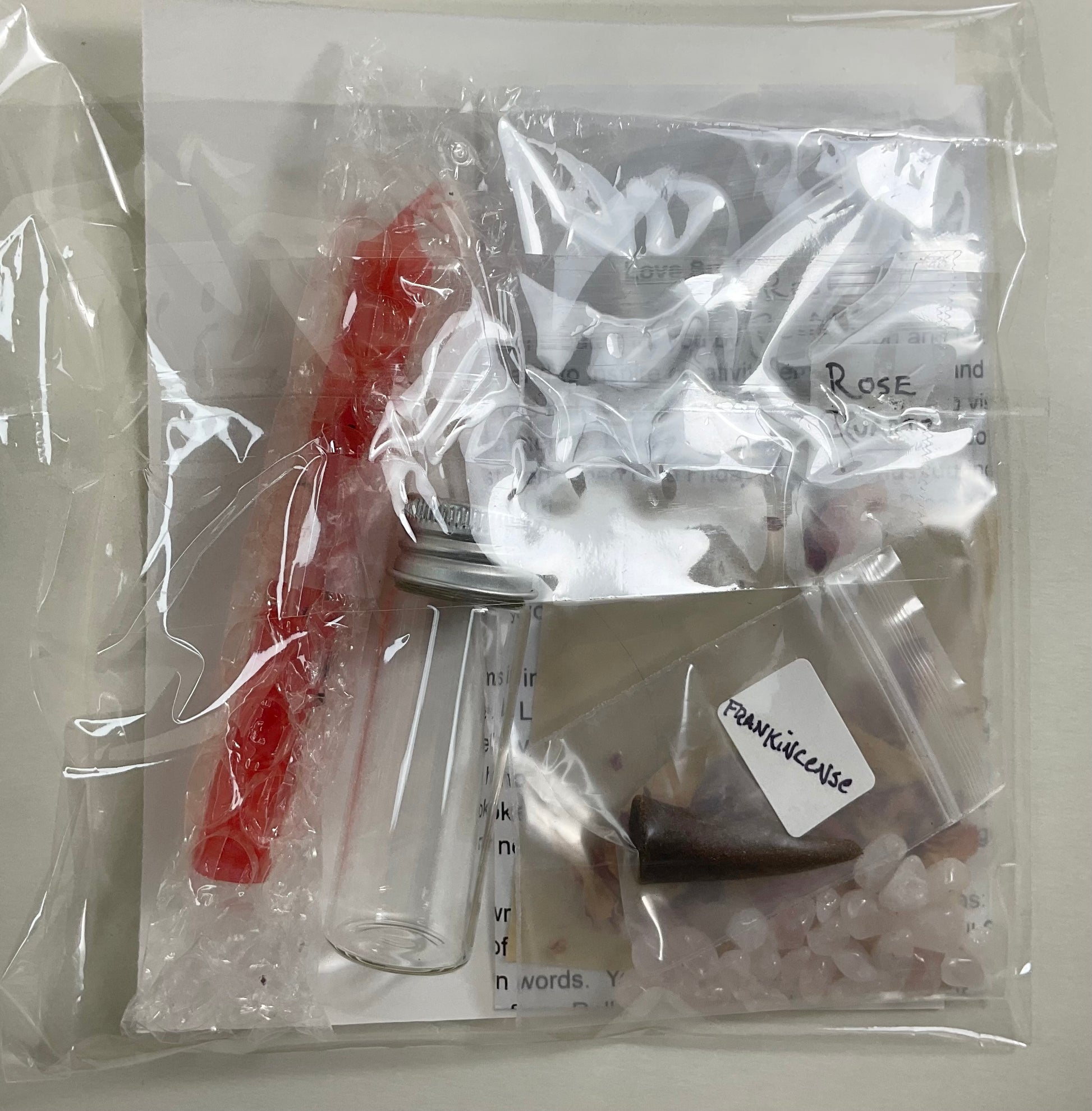 Each Kit comes with: fixed Love candle, spell bottle, 1 pack of rose quartz chips, 1 pack herb of Venus, 1 frankincense cone, 1 piece of parchment for writing your spell intention on…and of course complete instructions on how to cast this spell.