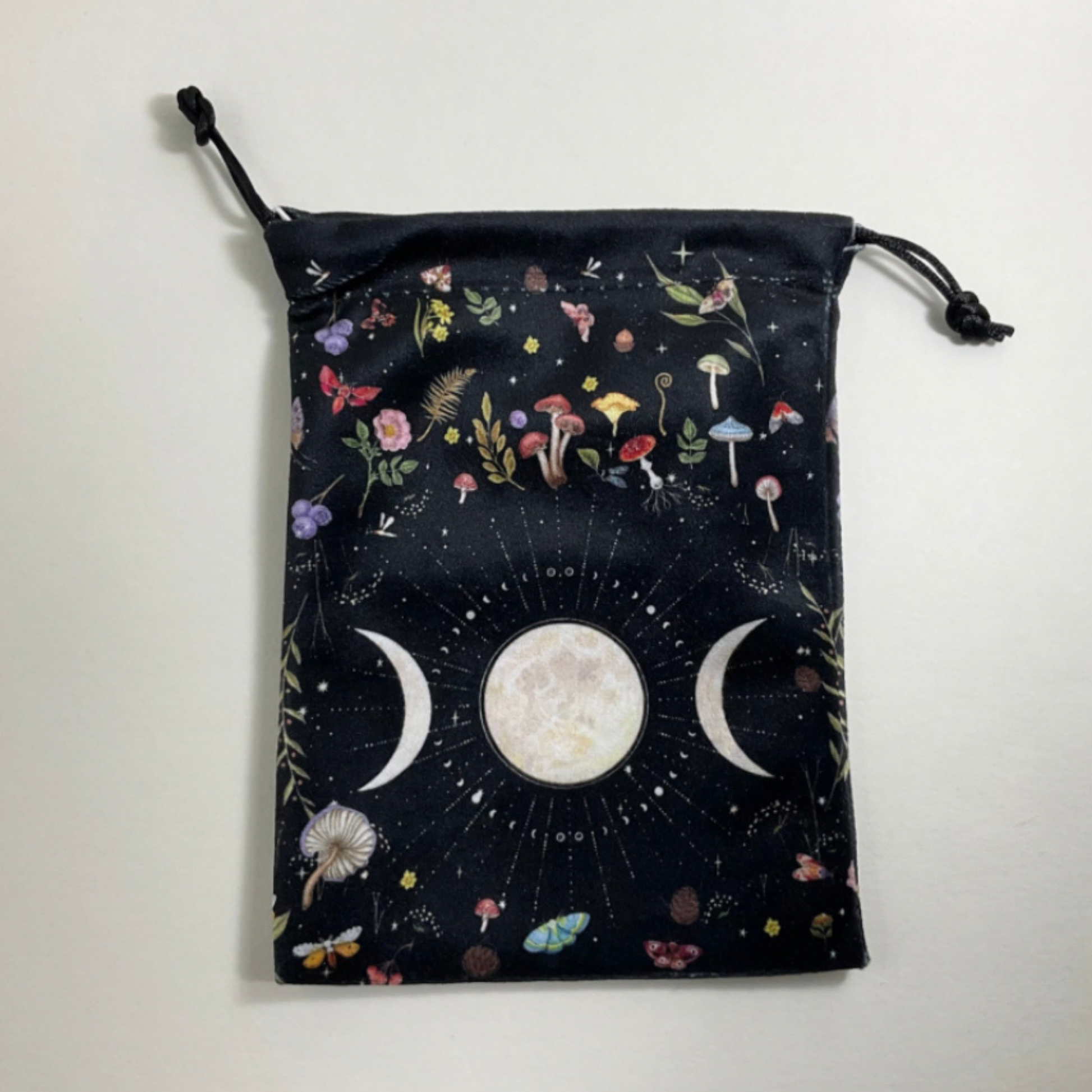 Triple Moon Goddess Symbol and decorative mushrooms and flowers against black…truly beautiful. Drawstring closure.