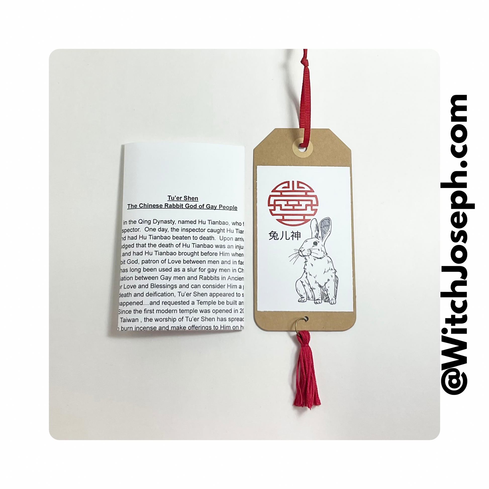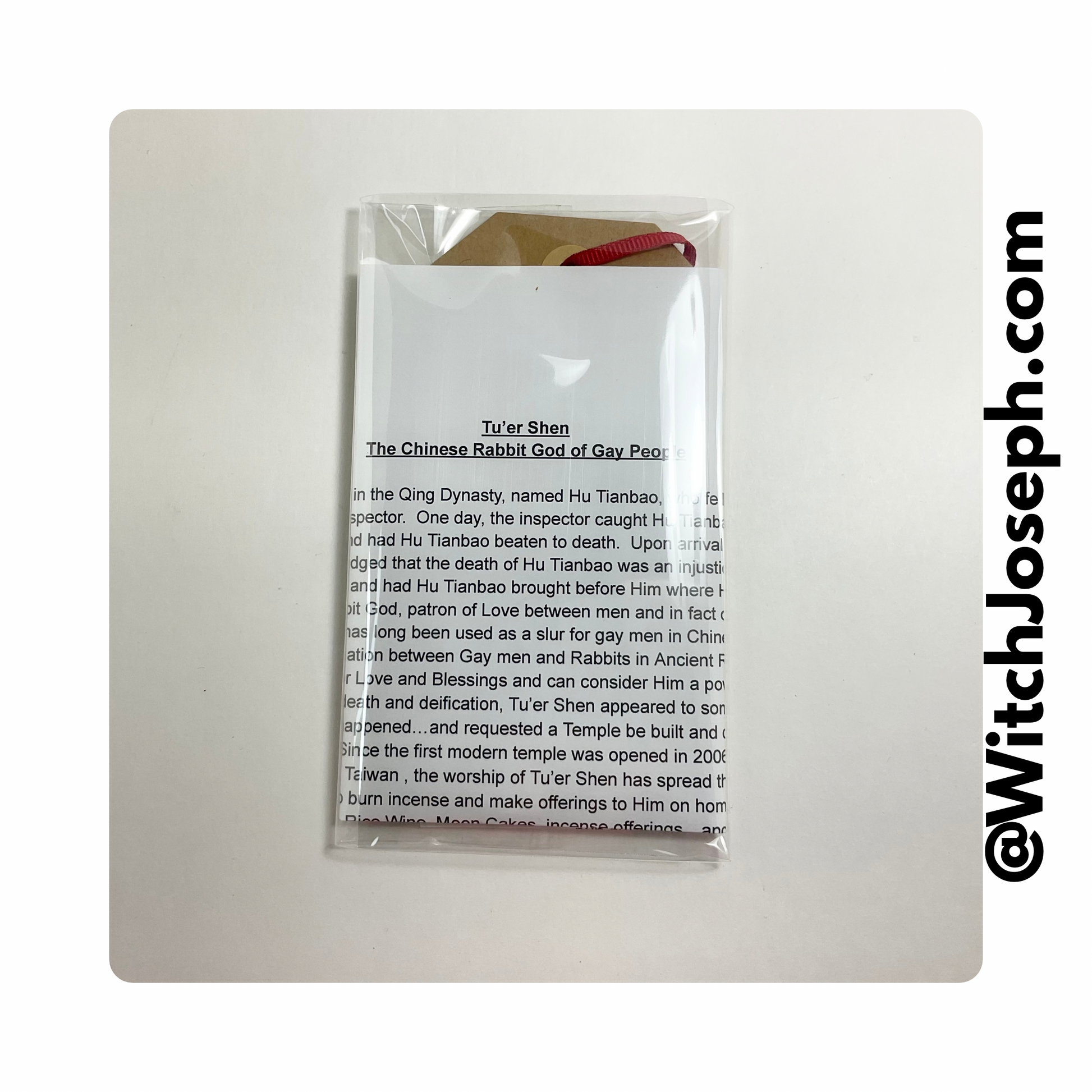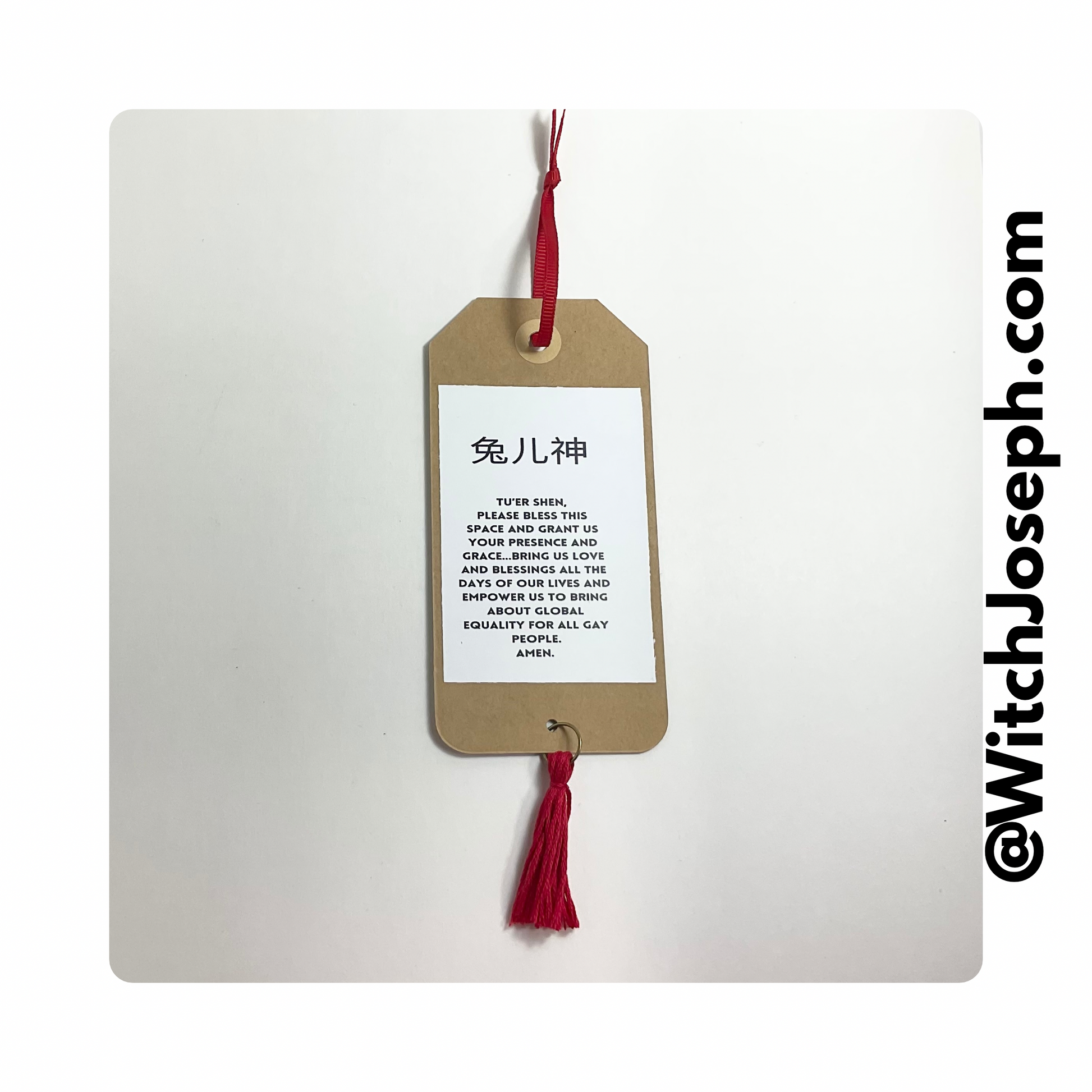 A Prayer/Blessing Card to the Chinese Rabbit God of Gay People, Tu’er Shen. The worship of Tu’er Shen was long suppressed but is now once again spreading to the people, all around the world. The Prayer Card can be hung in the home or car, in your shrine or altar…and can be used to bless the space and ask for Tu’er Shen to be present and bless our lives…comes with a print out of the story of Tu’er Shen along with a prayer that can be used for petitions and offerings. May Love and Equality prevail everywhere on Earth. The Prayer/Blessings card is approx 5” x 2.750”, with approx 3.500” ribbon hanger and approx a 1” tassel.