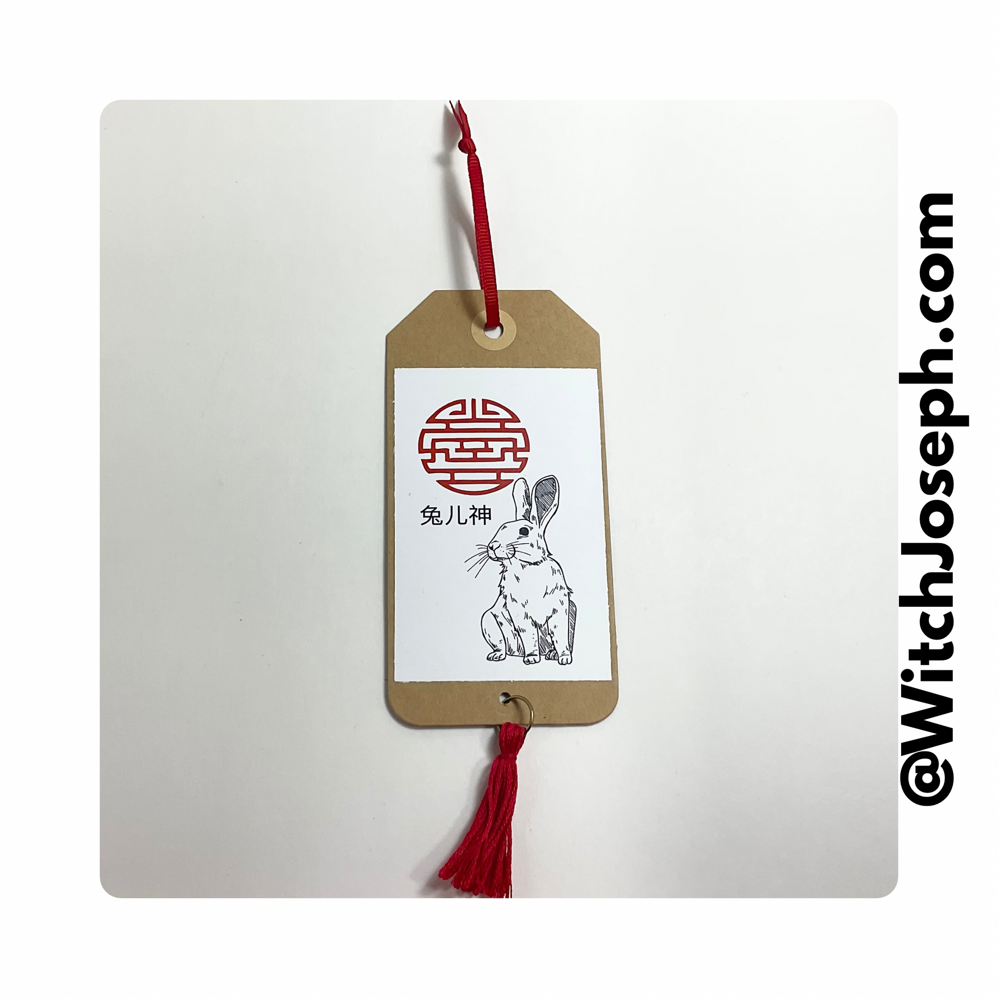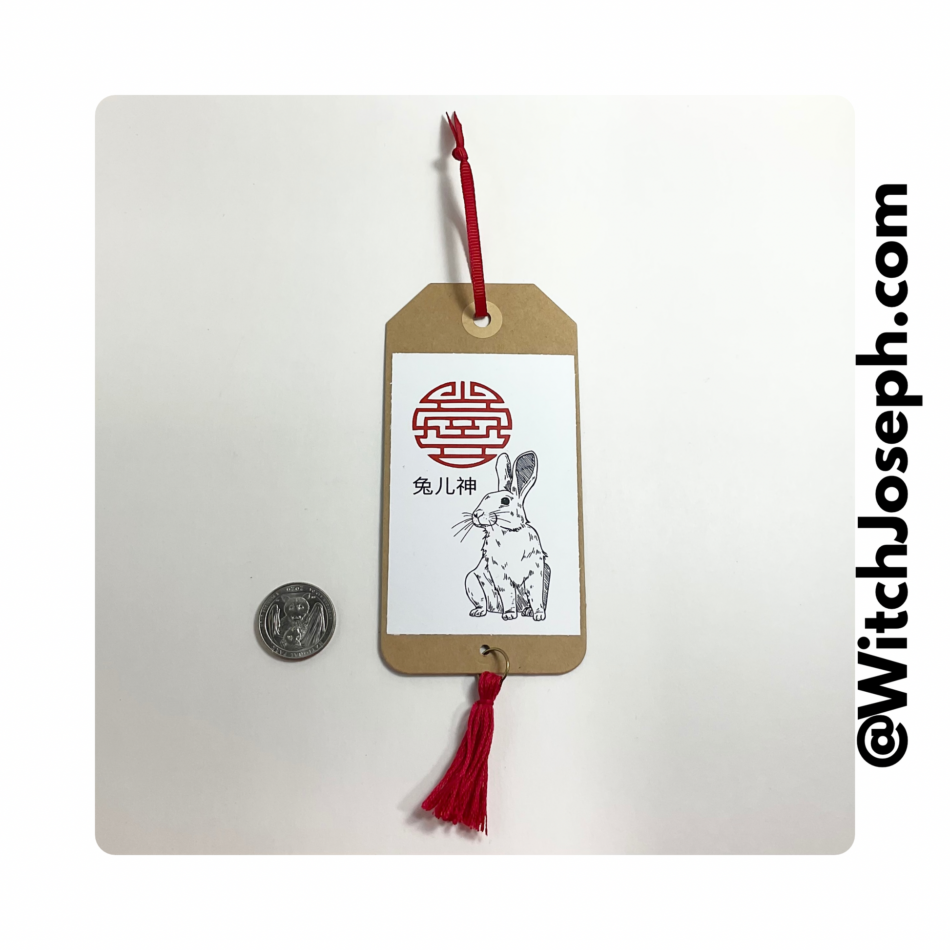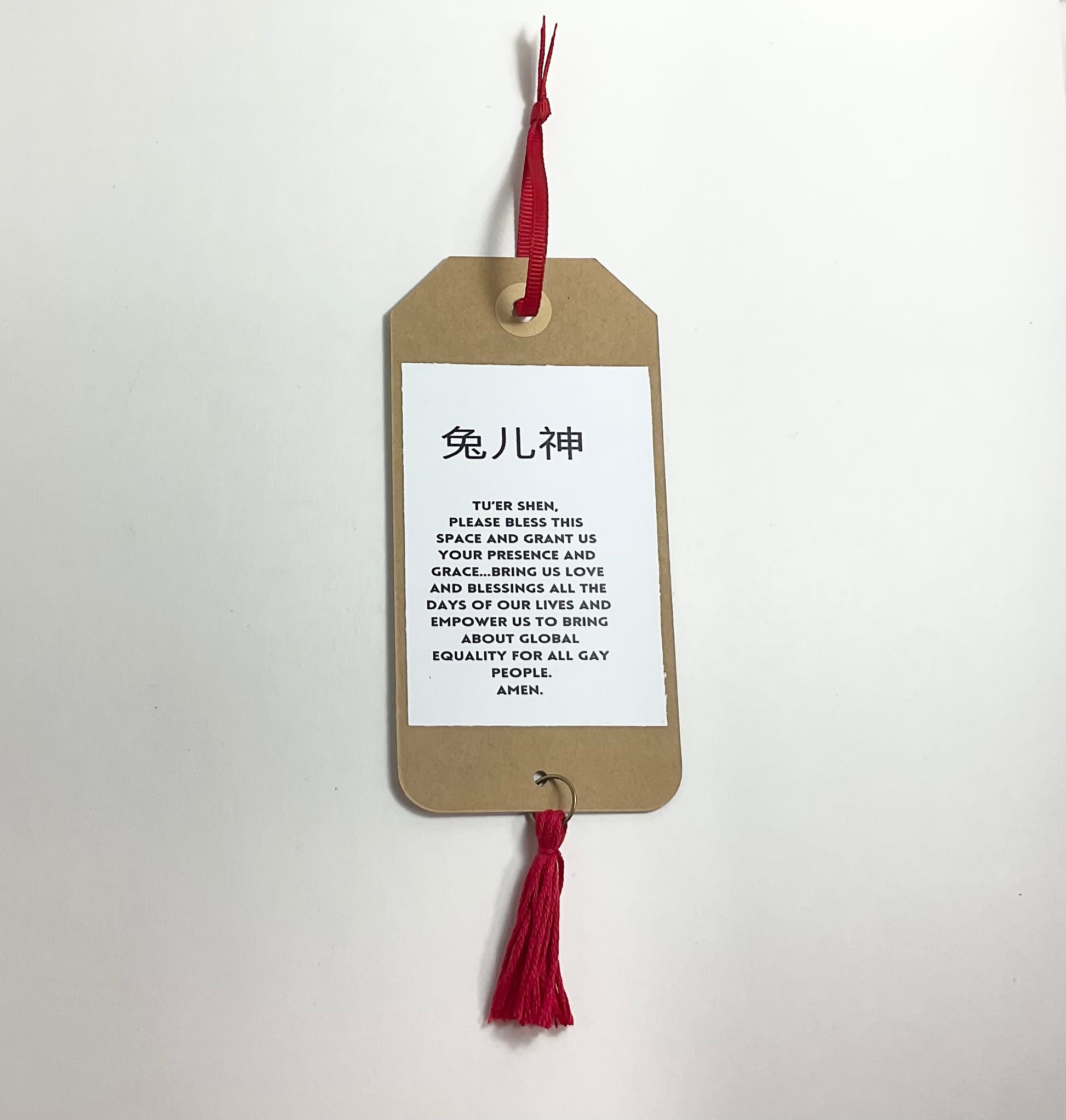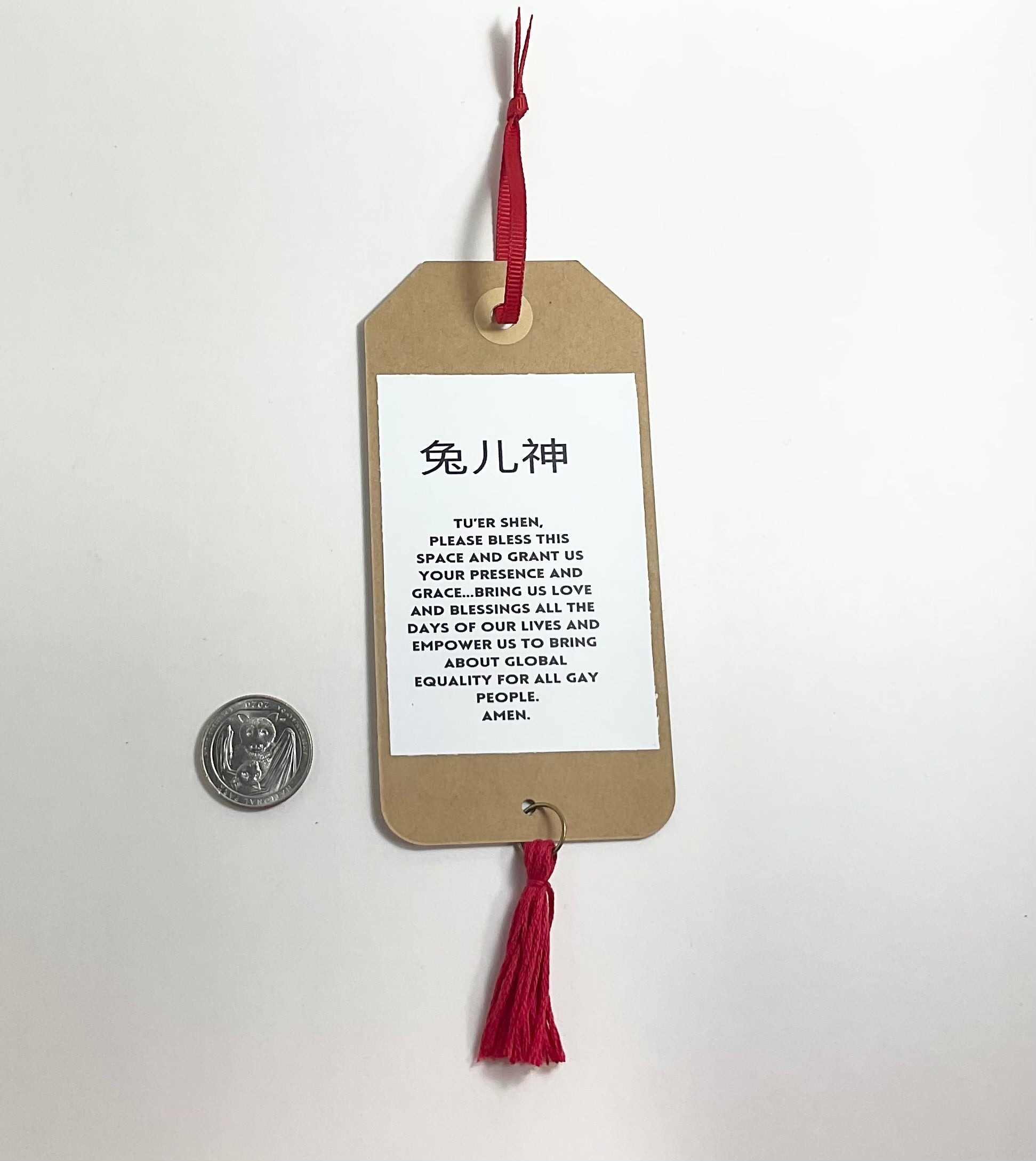 A Prayer/Blessing Card to the Chinese Rabbit God of Gay People, Tu’er Shen. The worship of Tu’er Shen was long suppressed but is now once again spreading to the people, all around the world. The Prayer Card can be hung in the home or car, in your shrine or altar…and can be used to bless the space and ask for Tu’er Shen to be present and bless our lives…comes with a print out of the story of Tu’er Shen along with a prayer that can be used for petitions and offerings. May Love and Equality prevail everywhere on Earth. The Prayer/Blessings card is approx 5” x 2.750”, with approx 3.500” ribbon hanger and approx a 1” tassel.