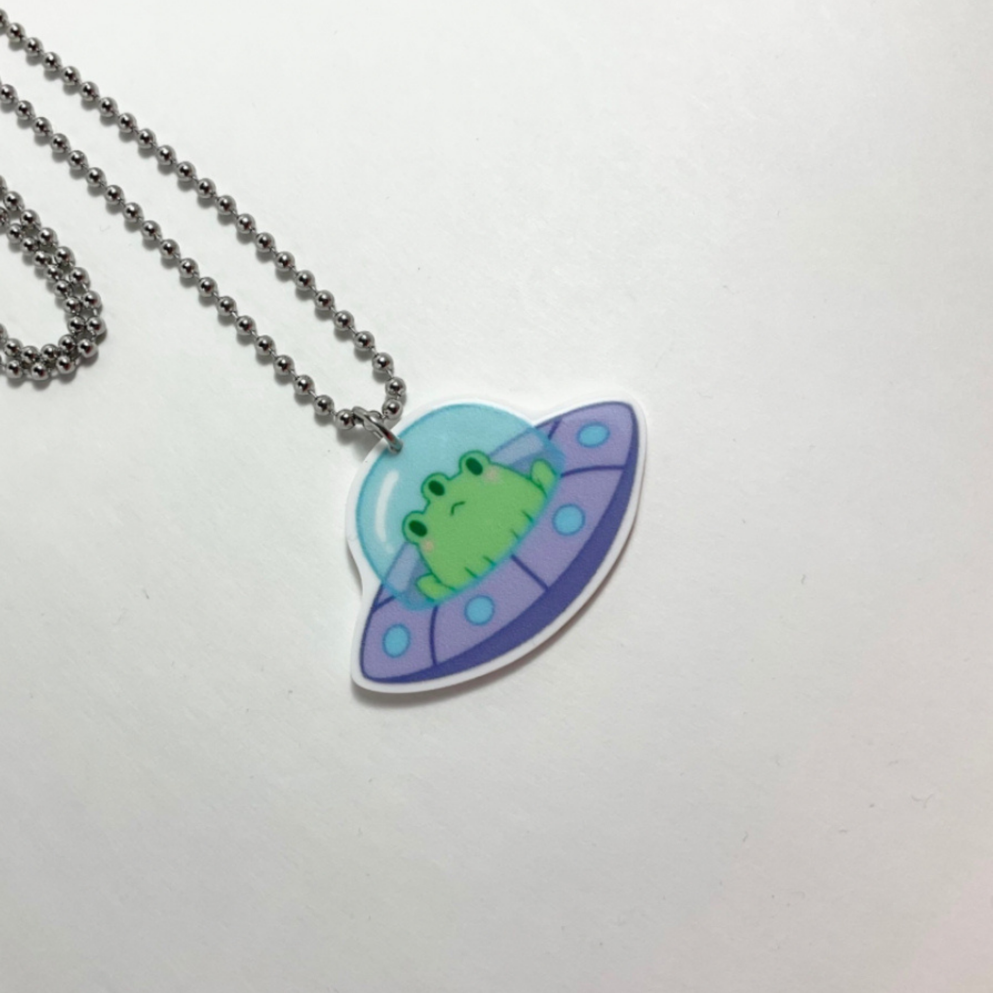 Adorable acrylic UFO/Flying Saucer with Alien Frog Charm necklace…single sided.