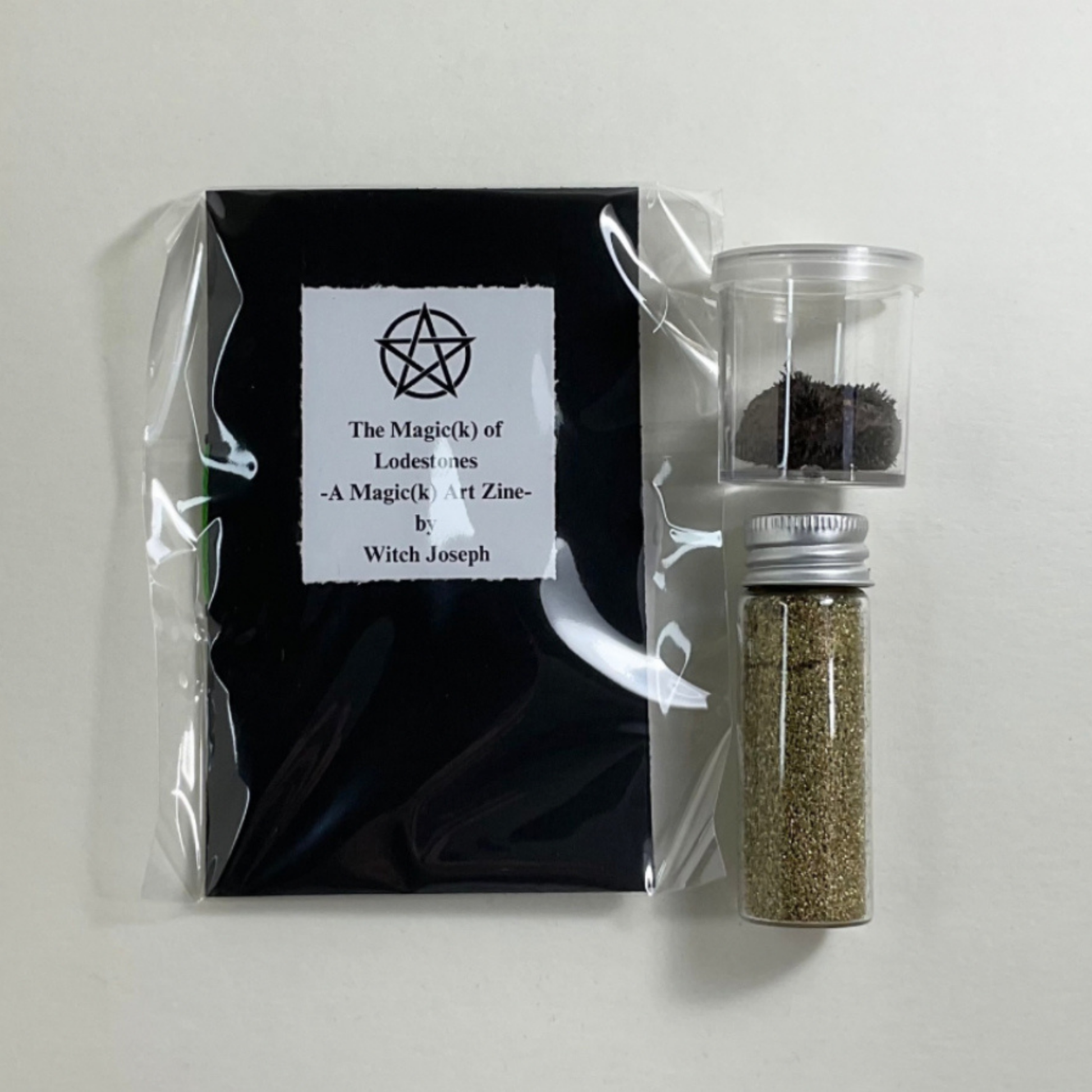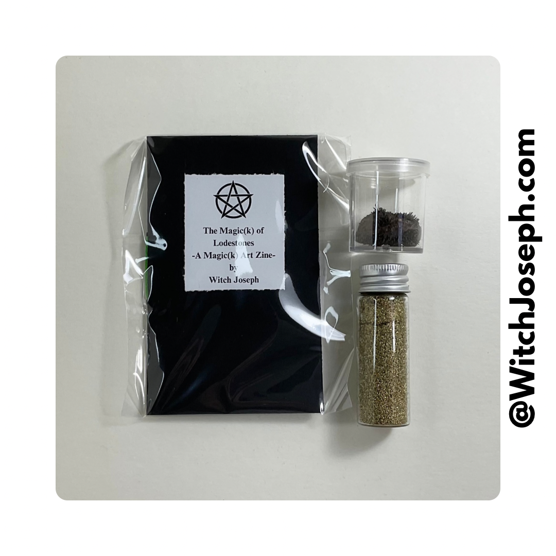 Lodestones have been used in many cultures and different times…and are seen as having the ability to be able to attract things into the lives of practitioners. This kit comes with a Lodestone (.5”-1”), a 2 oz container of Gold magnetic sand (“food” for the Lodestone, to empower it to work for your goals), and a copy of “The Magick of Lodestones, a Magick Art Zine by Witch Joseph” that has lots of information and practical suggestions for working with your Lodestone.”