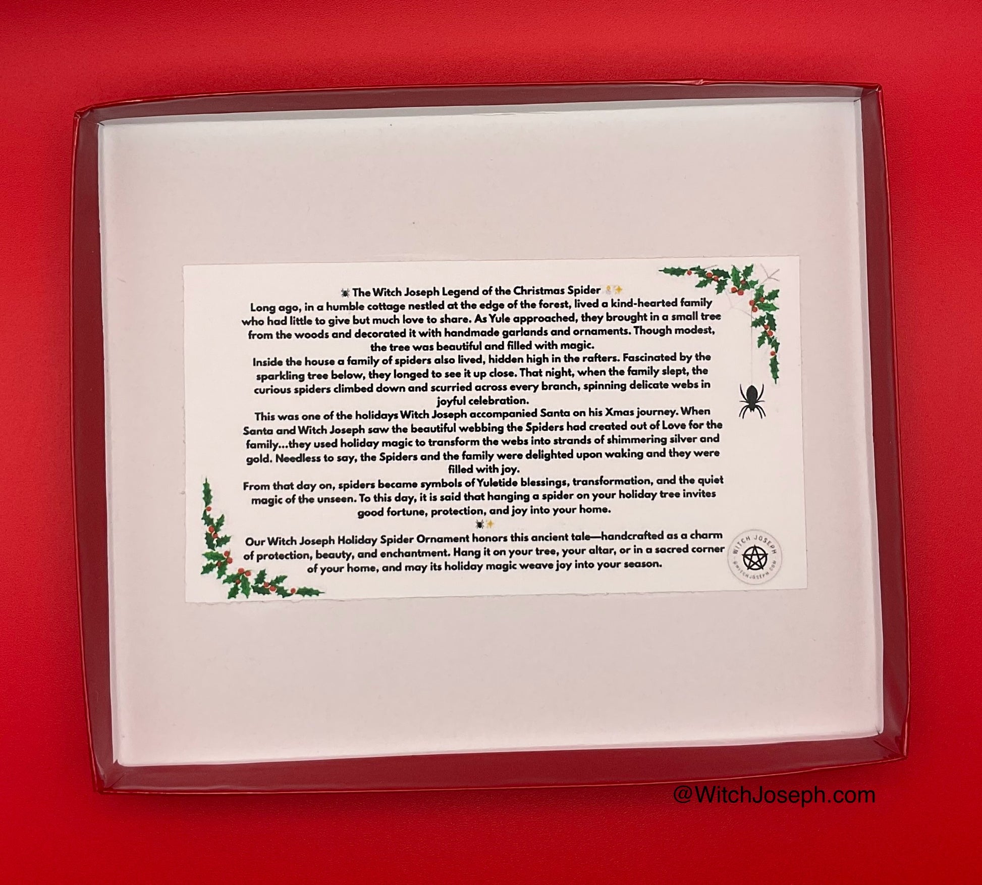 Our Witch Joseph Holiday Spider Ornament honors this ancient tale—handcrafted as a charm of protection, beauty, and enchantment. Hang it on your tree, your altar, or in a sacred corner of your home, and may its holiday magic weave joy into your season.